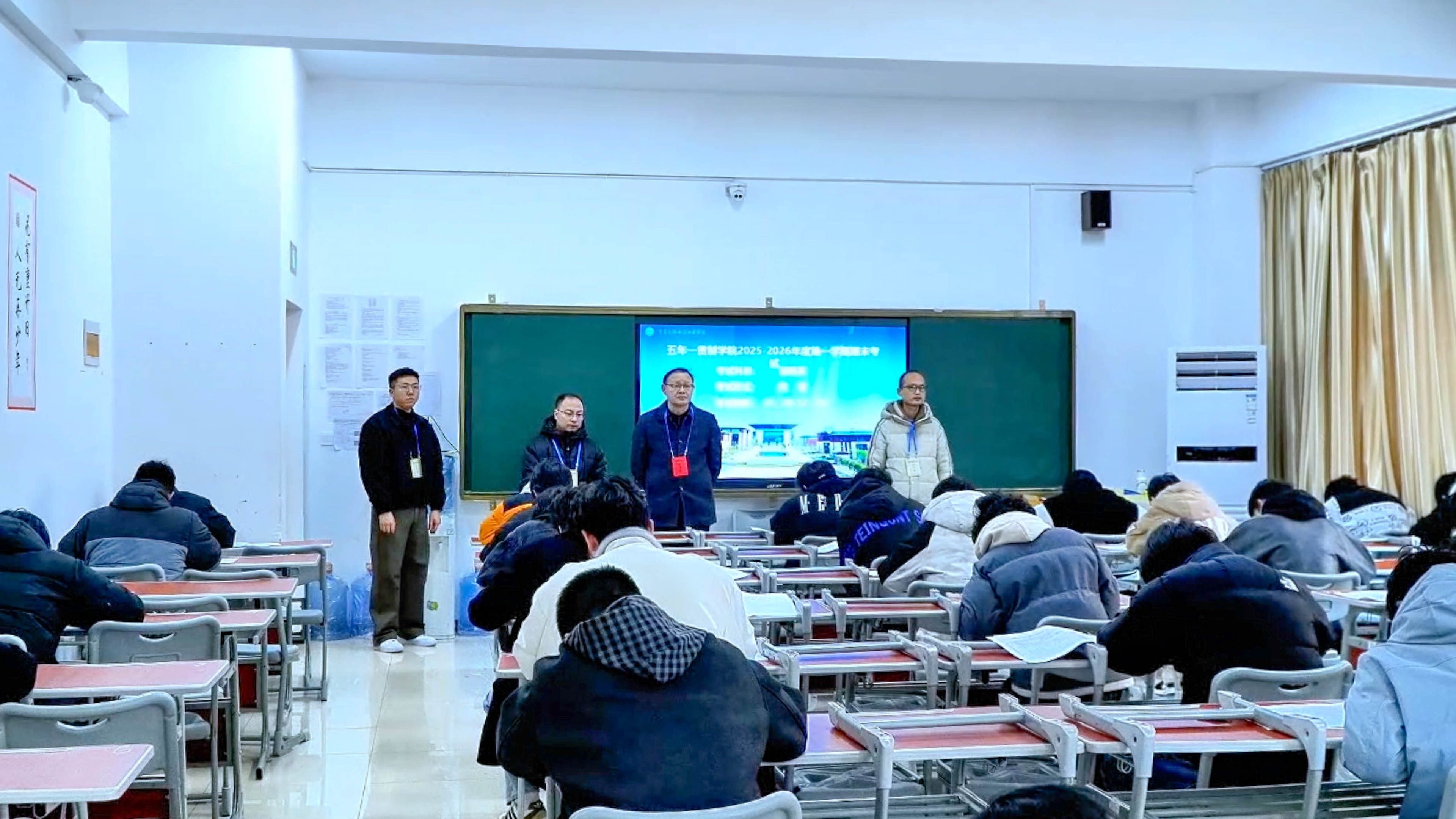 从巡考情况来看,本次期末考试各项准备工作充分扎实,考务安排科学规范。各考场环境整洁、布置规范,监考教师按时到岗、恪尽职守,严格核对考生身份信息,认真宣读考试规则,全程专注履职,细致做好考场管理;考生们自觉遵守考试纪律,携带规定用品有序就座,专注审题、认真作答,考场内秩序井然,整体呈现出严谨有序、诚信应考的良好氛围。校领导对本次期末考试的组织筹备、考风考纪及现场管理工作给予了充分肯定。