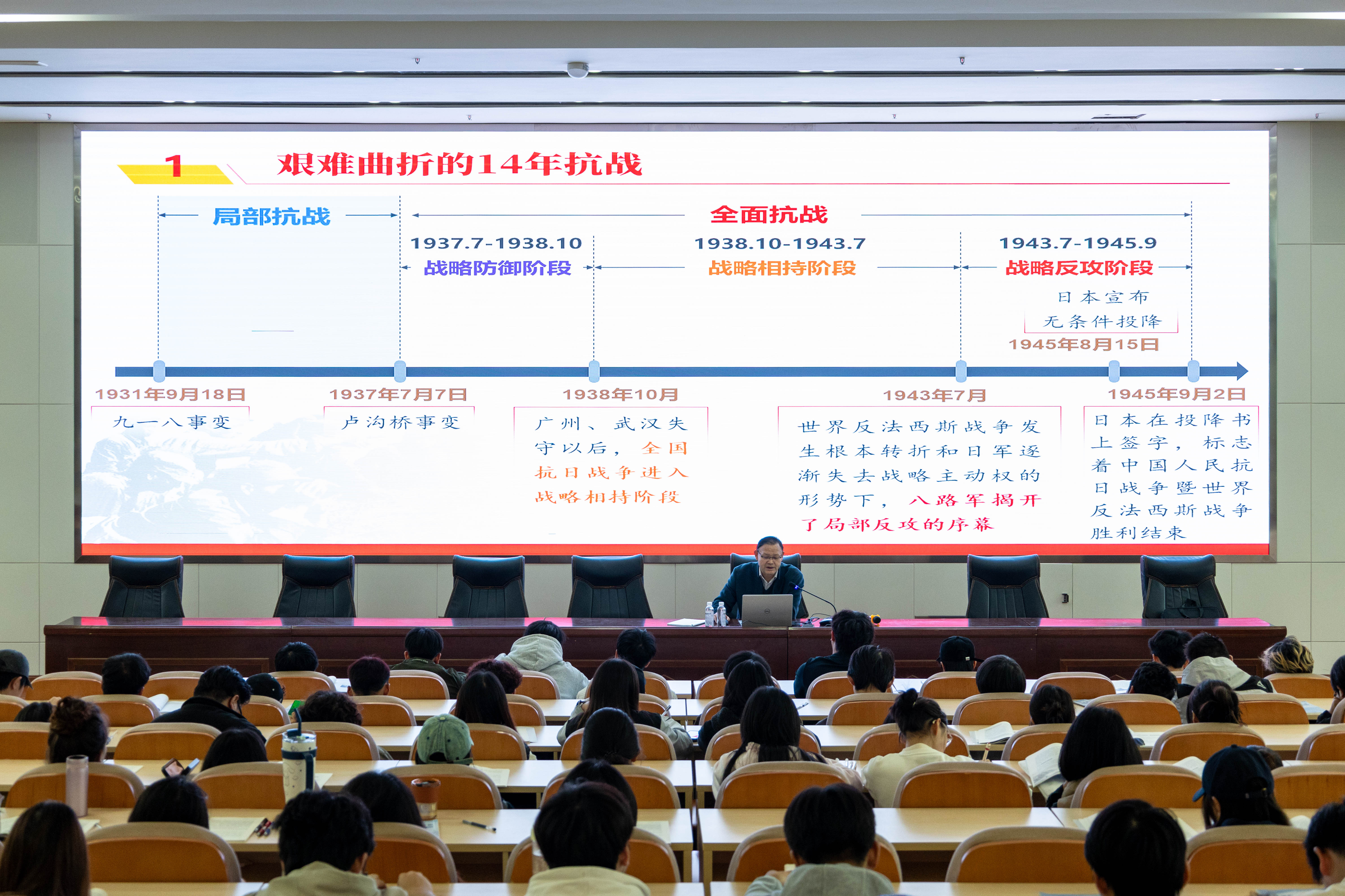 李勋华书记以“纪念抗战胜利,坚定民族信念”为核心,带领同学们重温波澜壮阔的抗战历史。他从“九一八事变后的救亡图存” “平型关大捷的战略意义”等历史细节切入,结合珍贵史料片段与抗战英雄事迹,生动再现了中华儿女在抗战中展现出的顽强斗志与爱国情怀,深刻阐释了伟大抗战精神在当代的时代价值与传承意义。课堂互动环节,同学们踊跃分享身边的红色故事,表达对英雄的崇敬之情。李勋华书记认真倾听后勉励同学们从历史中汲取奋进力量,将坚定的理想信念与深厚的爱国情怀,转化为刻苦学习专业知识、奋发成才的实际行动。